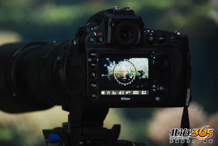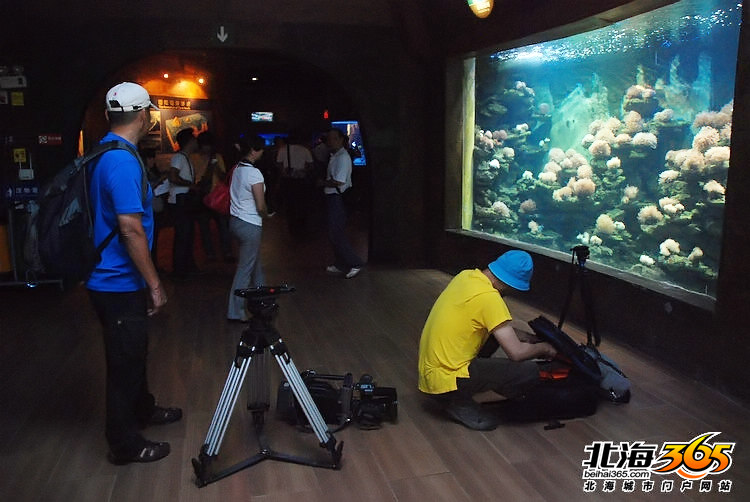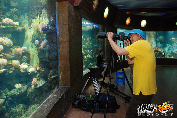 海洋之窗的讲解员在给龙导讲解珊瑚 进到珊瑚厅,摄制组就放下装备开始干活。穿黄色衣服的是负责摄影的陈浩,他是广西电视台的记者。摄制组带来了一大堆摄像器材,有三脚架有摄像机,但是我却见到陈浩从包里掏出了一台尼康D800E相机,装在三脚架上开始拍摄,而大型肩扛机却放在地上。