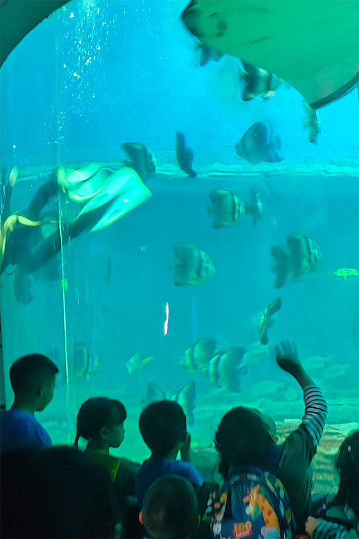 海洋之旅的后半段同样精彩纷呈,那就是观看精彩的水下表演。看着美丽的美人鱼在水中优雅地舞动,帅气的喂鱼小哥哥与鱼儿们默契互动,“小东北虎”们惊叹不已。