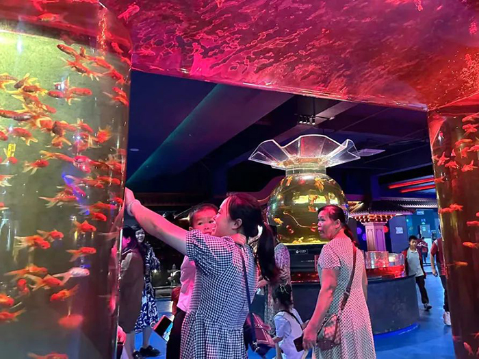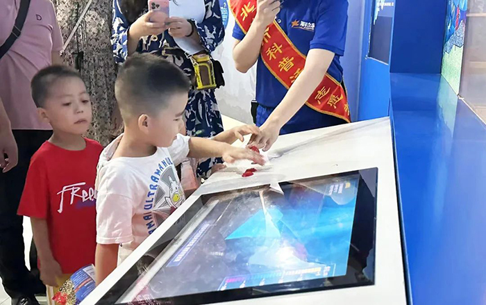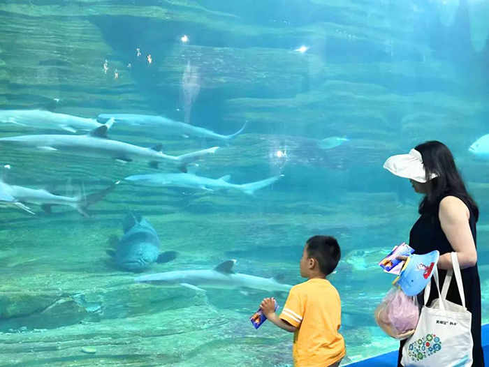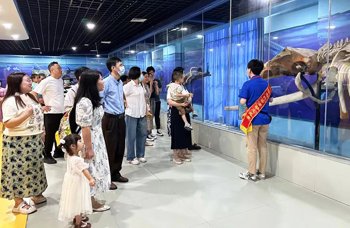 在海洋小课堂展厅,种类繁多的海洋生物标本和海洋科学知识让小朋友们目不暇接;讲解员生动地讲述了翻车鲀、中华鲟、抹香鲸等海洋生物的知识,并用通俗易懂的语言解释了海水的作用,如何测量海深等原理,书本上的知识在这里都变得立体。同时,珊瑚海区、南海龙宫区、水母迷宫、锦鱼堂,家长和小朋友们观看到形态各异的海洋生物,纷纷留影打卡。