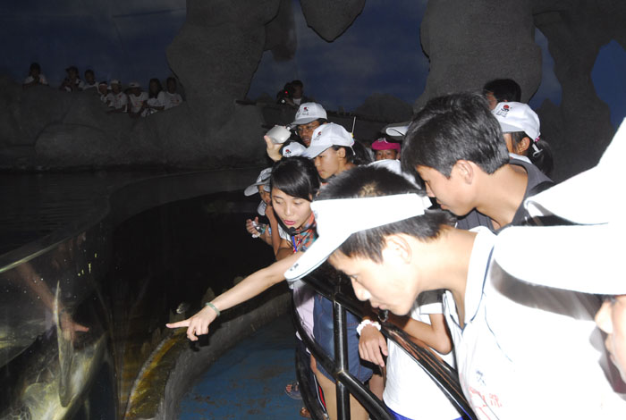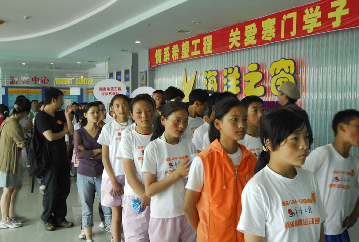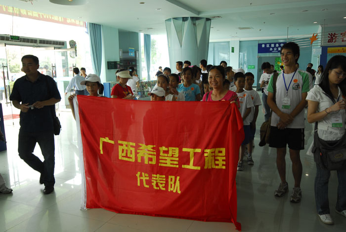 2008年5月11日,来自新疆、西藏、四川、内蒙古、宁夏、青海、广西等西部希望小学体育运动会的运动健儿约600人,在北海市团市委陈劲书记及希望工程、爱心企业志愿者的带领下,前来海洋之窗参观游览。 海洋之窗是全国科普教育基地,通过这次“情系希望工程,关爱寒门学子”活动,将北海人民的爱心、北海海洋之窗的关爱带给西部希望小学的学生,更为孩子们提供了信息的交流和科普教育的学习学习机会。 海洋之窗真正发挥了“窗口”的作用,展示内容丰富多彩,观赏与科教结合,讲解员个性化的服务,给西部远离大海的孩子们提供了一次对大海全面、近距离了解和学习的机会,丰富他们的阅历和生活。 广西代表队成员在海洋之窗大厅前举旗合影